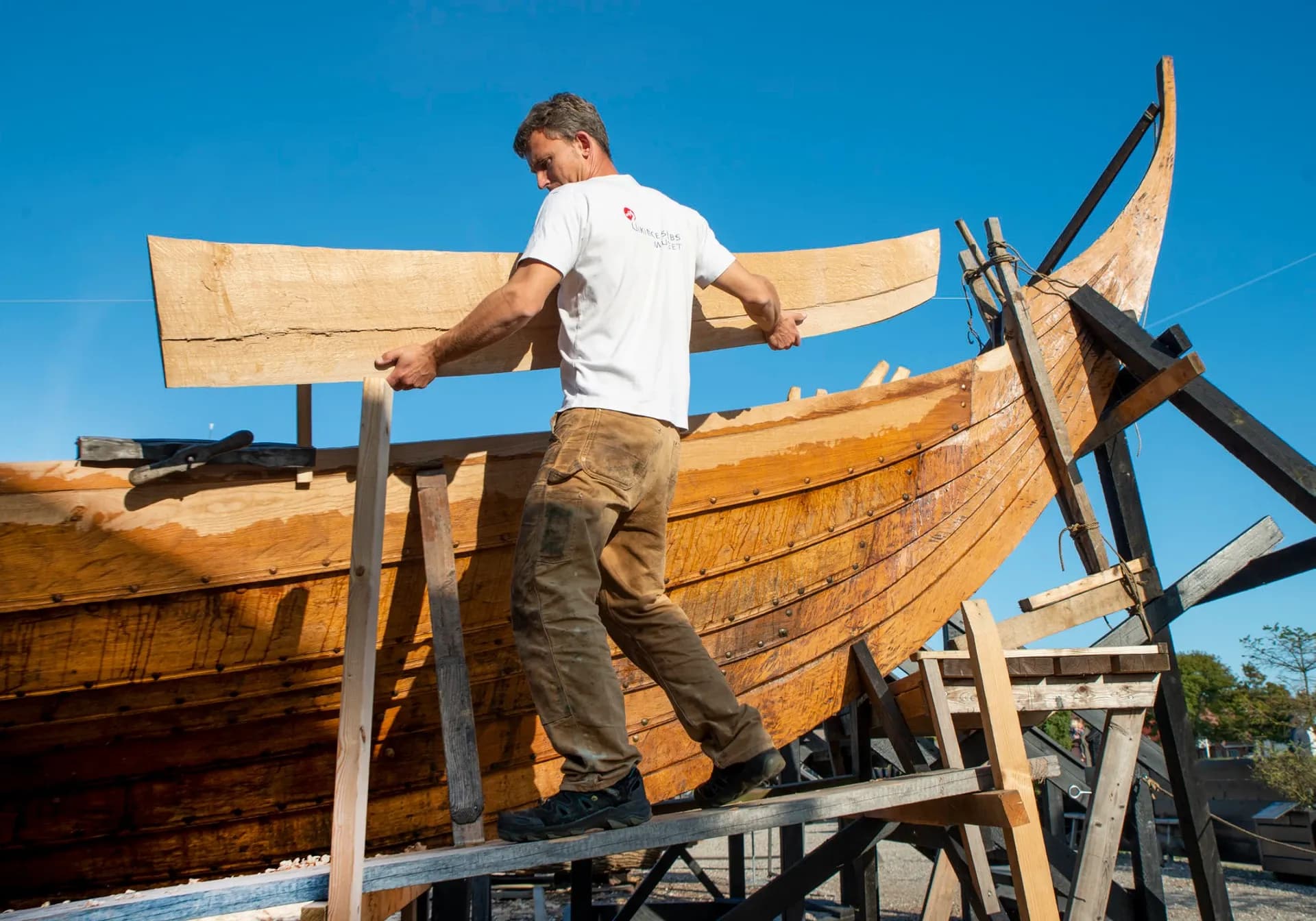 Schauen Sie zu, wie man Schiffe mit originalen Werkzeugen repariert und rekonstruiert. So benutzten z. B. die Schiffsbauer zum Bearbeiten des Holzes die Axt, da es zur Zeit der Wikinger keine Sägen gab.
