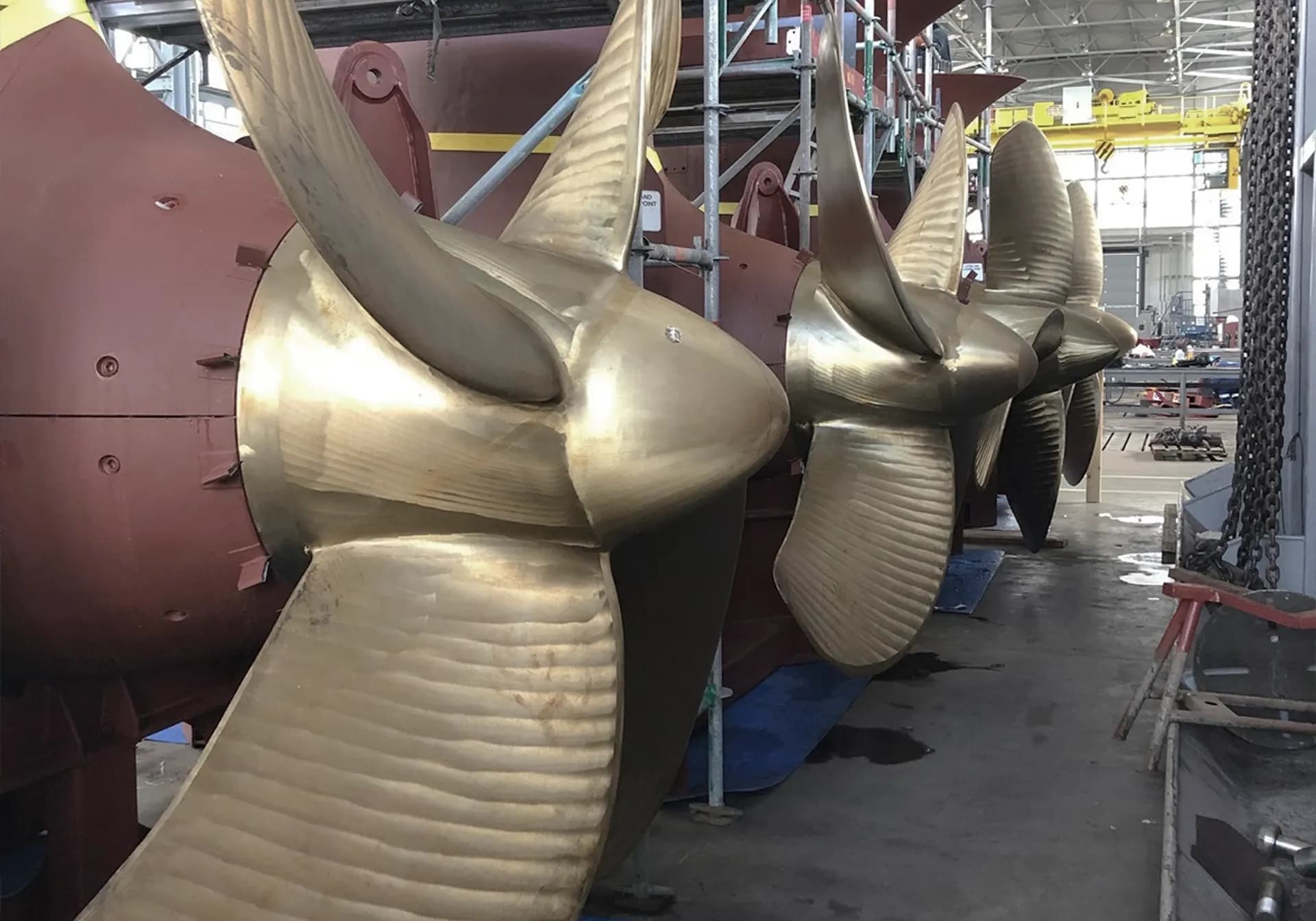 Wir steigen nun auf Hightech Pull-Thruster von Kongsberg Maritime um. Der Propeller sitzt vorne am Thruster, sodass ein homogenerer Flow durch das Wasser erzielt wird. Die neuen Antriebspropeller haben jeweils vier Propellerblätter, einen Durchmesser von 3,2 Metern und wiegen 25 Tonnen.
