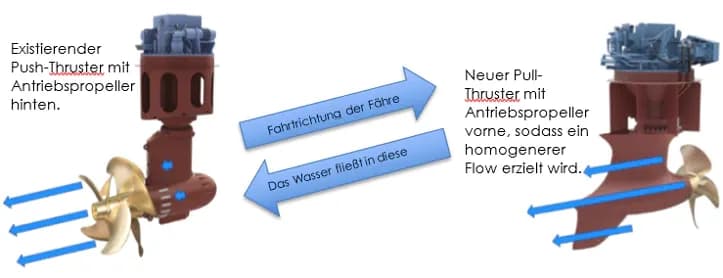 Bei den ehemaligen Push-Thrustern saß der Antriebspropeller hinten, sodass das Wasser erst am Thruster vorbei musste, bevor es den Antriebspropeller erreichte.
